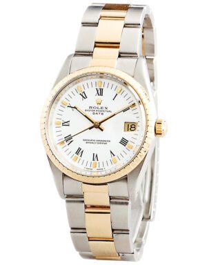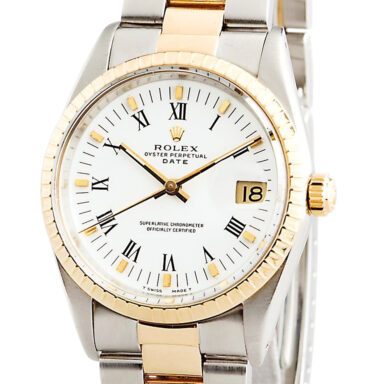 BeckerTime is proud to offer this impressive Men’s 34mm Rolex 2tone 18k Yellow Gold/Stainless Steel Date Watch model ref #15223 with a White & Black Roman Dial. And that’s not all…This is the QUICKSET MODEL with a SAPPHIRE CRYSTAL and a Rolex Oyster band. This Rolex is in SUPER EXCELLENT CONDITION.