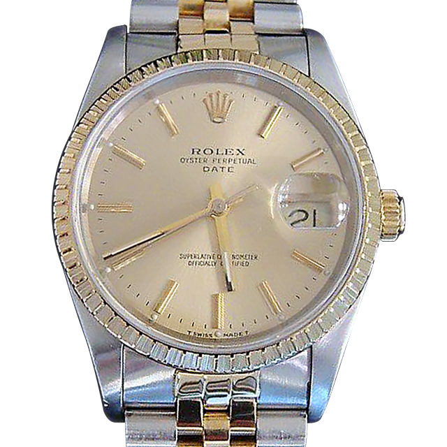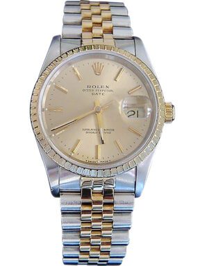BeckerTime is proud to offer this impressive Men’s 34mm Rolex 2Tone 18K Yellow Gold & Stainless Steel Date Watch model ref #15223 with a Gold Champagne Dial. This is the desired QUICKSET MODEL with the SAPPHIRE CRYSTAL and a Rolex Jubilee band. This Rolex is in SUPER EXCELLENT CONDITION.