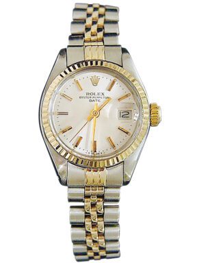 BeckerTime is proud to offer this beautiful Ladies 26mm Rolex 2Tone 14K Yellow Gold & Stainless Steel Date Watch model ref #6917 with a Silver Dial. And it gets better…It has a Rolex USA Oval Link Jubilee band. This Rolex is in EXCELLENT CONDITION.