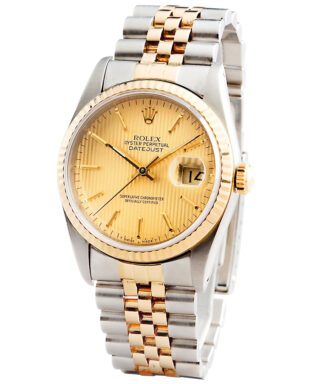 BeckerTime is proud to offer this handsome Men’s 36mm Rolex 2Tone 18K Yellow Gold & Stainless Steel Datejust Watch ref #16233 with a Gold Tapestry Dial. And it get’s better…This is the desired QUICKSET MODEL with the SAPPHIRE CRYSTAL and a Rolex Jubilee band. This Rolex is in EXCELLENT CONDITION.