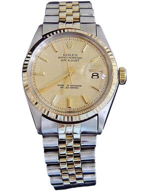 BeckerTime is proud to offer this handsome vintage Men’s 36mm 2Tone Yellow Gold & Stainless Steel Rolex Datejust Watch model ref #1601 with a Gold Linen Dial and Rolex Jubilee band. This Rolex is in EXCELLENT CONDITION.