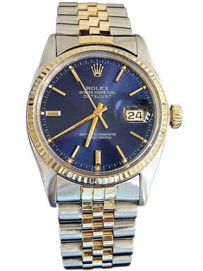 BeckerTime is proud to offer this handsome Men’s 36mm Rolex 2Tone 14k Yellow Gold & Stainless Steel Datejust Watch ref #16013 with a Blue Dial. And it get’s better…This is the QUICKSET MODEL and has a Rolex Jubilee band. This Rolex is in EXCELLENT CONDITION.