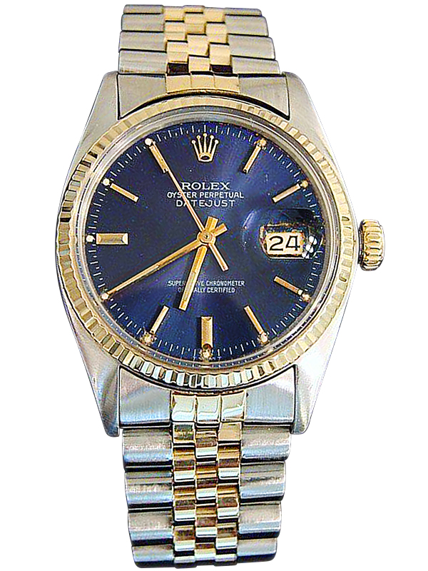 | Dial | Rolex BLUE dial with raised yellow gold stick markers; Some spotting/wear. |