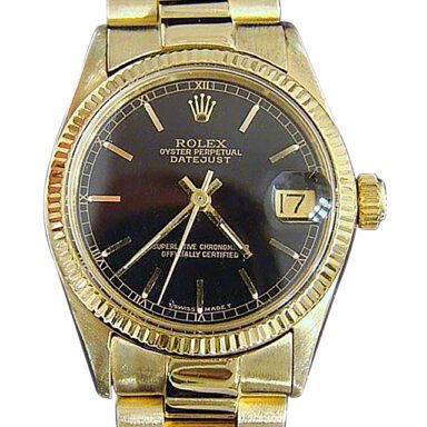 BeckerTime is proud to offer this stunning vintage Ladies Midsize 31mm Solid 18K Yellow Gold Rolex Datejust Watch ref #6827 with a Black dial and Fluted Bezel. This Rolex has been fitted with a custom aftermarket 18k yellow gold presidential style band. It is in EXCELLENT CONDITION.