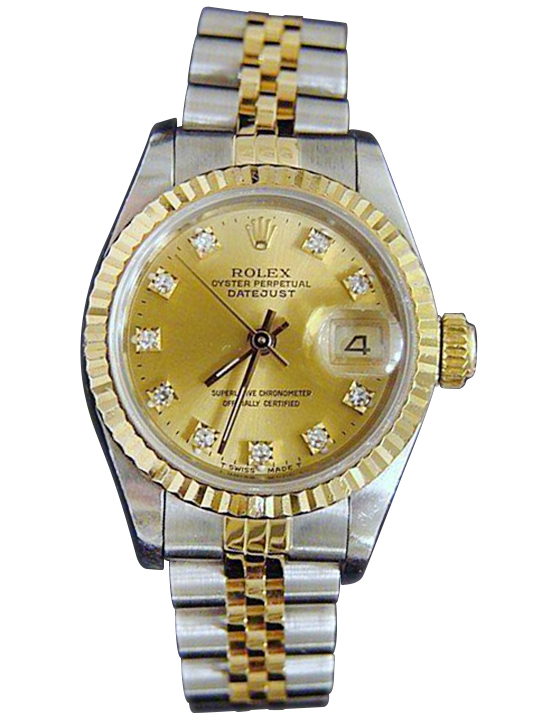 | Dial | Rolex GOLD CHAMPAGNE dial with 10 round brilliant diamonds. This is a factory original Rolex diamond dial! |