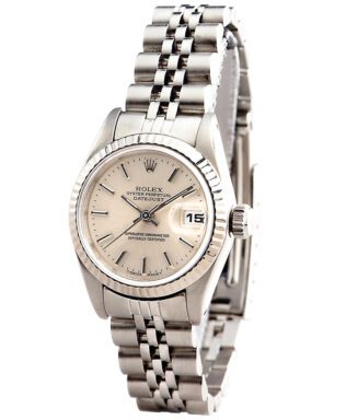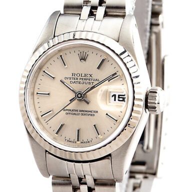BeckerTime is proud to offer this impressive Ladies 26mm Rolex Stainless Steel/18K White Gold Datejust Watch ref #69174 with a Silver Dial. This is the desired QUICKSET MODEL with the SAPPHIRE CRYSTAL and a Rolex Jubilee band. This Rolex is in SUPER EXCELLENT CONDITION.
