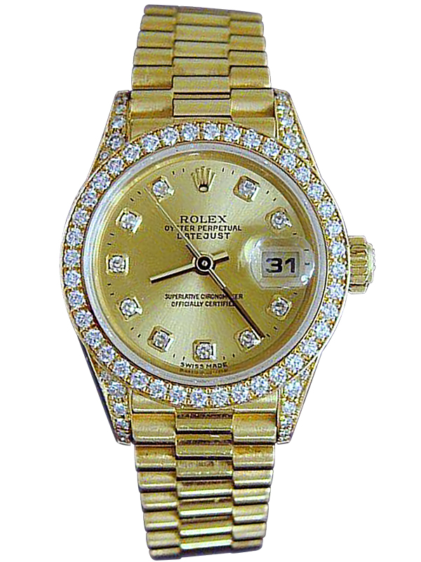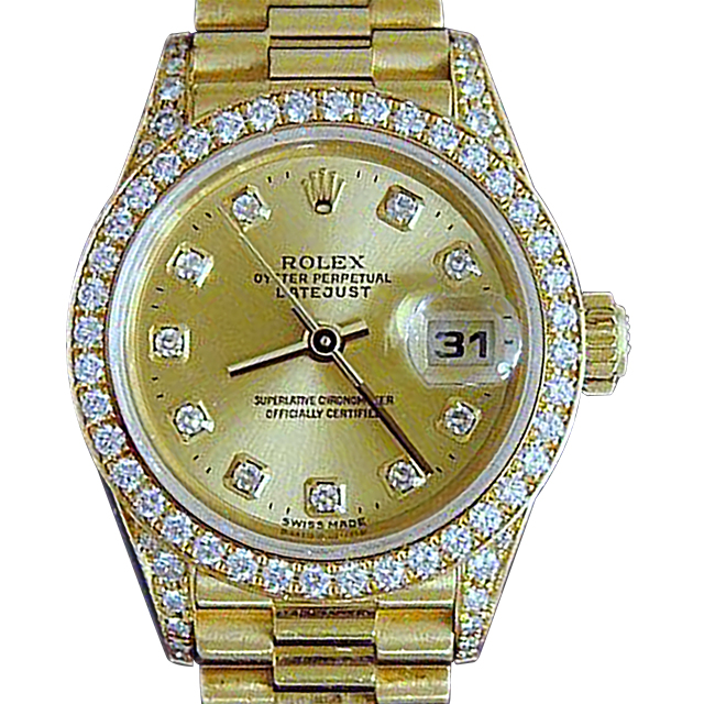 | Dial | Rolex GOLD CHAMPAGNE dial with 10 round brilliant diamond markers. This is a factory diamond dial produced by Rolex. |